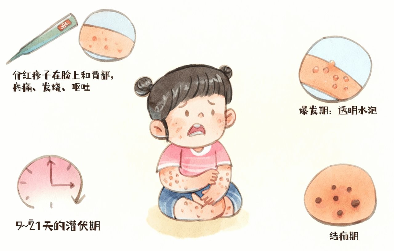 出疹期:首先出现红色斑疹,数小时后变为丘疹并发展成疱疹,疱疹内充满清亮液体,易破溃,伴有瘙痒,1-2天后疱疹从中心开始干枯、结痂,约1周痂皮脱落。