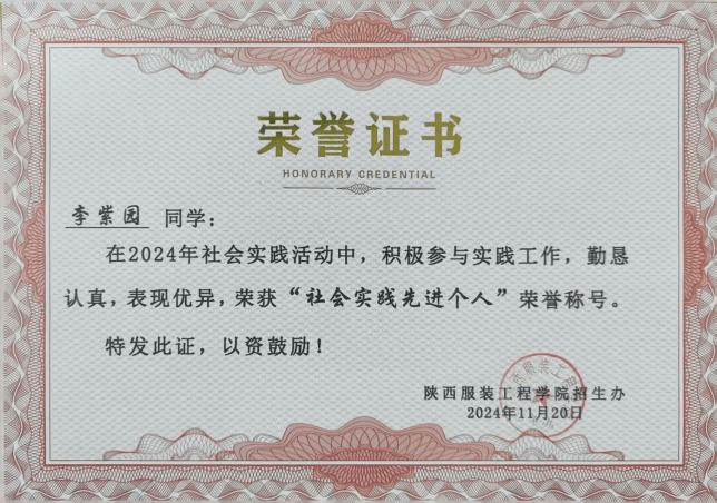 作为一名新时代大学生,她深知“读万卷书,行万里路”的道理,在学业之余,积极投身于各类实践活动,践行新时代青年的责任与担当。在社会实践方面,她表现出强烈的服务意识和出色的组织能力。在2024年暑期迎新生社会实践活动中,她热情周到地协助新生办理入学手续,耐心解答疑问,用真诚的笑容和细致的服务消除了新生初入校园的陌生与不安,因其突出表现,荣获“社会实践先进个人”称号。