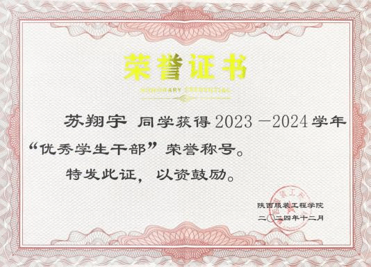 主要荣誉:国家奖学金、国家励志奖学金、“优秀学生标兵”、“优秀团干部”、“优秀学生干部”、“优秀学生”、英语学科竞赛省级奖项、西咸新区半程马拉松社会实践优秀参与者等。