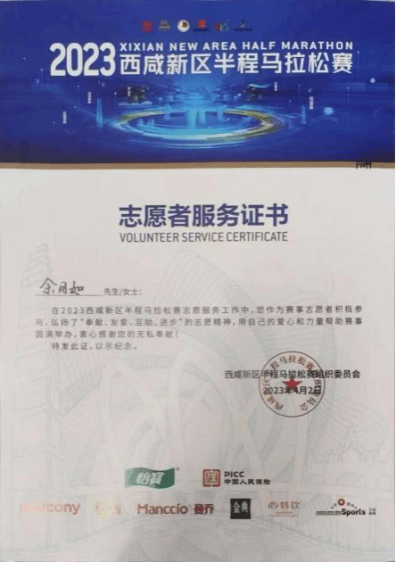 在志愿服务中,她积极响应学校号召,参与“西咸新区半程马拉松志愿服务”“社区养老院敬老活动”等活动,累计服务时长超200小时。在西咸新区半程马拉松活动中,她负责选手物资发放、赛道补给引导等工作,连续坚守岗位8小时,保障了赛事环节的顺利推进;在社区养老院敬老活动中,她耐心教老人们使用智能手机视频通话、查阅健康资讯,为老人们表演节目、陪伴聊天,用温暖驱散孤独。她常说:“志愿服务不仅是奉献,更是自我成长的过程,在帮助他人的同时,我也收获了责任感与幸福感。”