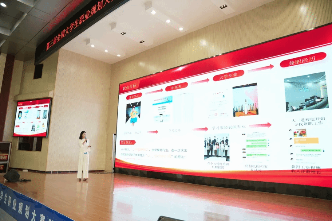 我校晋级决赛的3位同学在不同赛道各展所长,其职业规划紧扣时代需求与个人特质,体现了鲜明的应用型人才培养特色:服装学院孙铭麒同学(高教组就业赛道金奖)以“宠物服装设计师”为职业目标。结合行业发展趋势,系统展现了百余款原创宠物服饰设计与市售爆款案例,诠释了“宠尚无界,绘职人生”的理念,展现了以创意设计赋能新兴产业的职业追求;艺术设计学院卢奥同学(职教组就业赛道铜奖)立志成为一名“少儿口才艺术培训师”。他聚焦少儿核心素养培育,规划通过系统的艺术语言教学,帮助少儿构建清晰的逻辑思维与自信的表达能力,践行“用语言艺术为成长赋能”的教育使命;服装学院孙卉如同学(职教组成长赛道铜奖)则将职业方向定位为“少儿模特培训师”。她巧妙融合个人模特专业学习经历与教育热情,规划为少儿T台教学、课程设计与秀场编排,为少儿提供专业的T台教学、课程计划和秀场编排,立志在美育领域开拓一片新天地。
