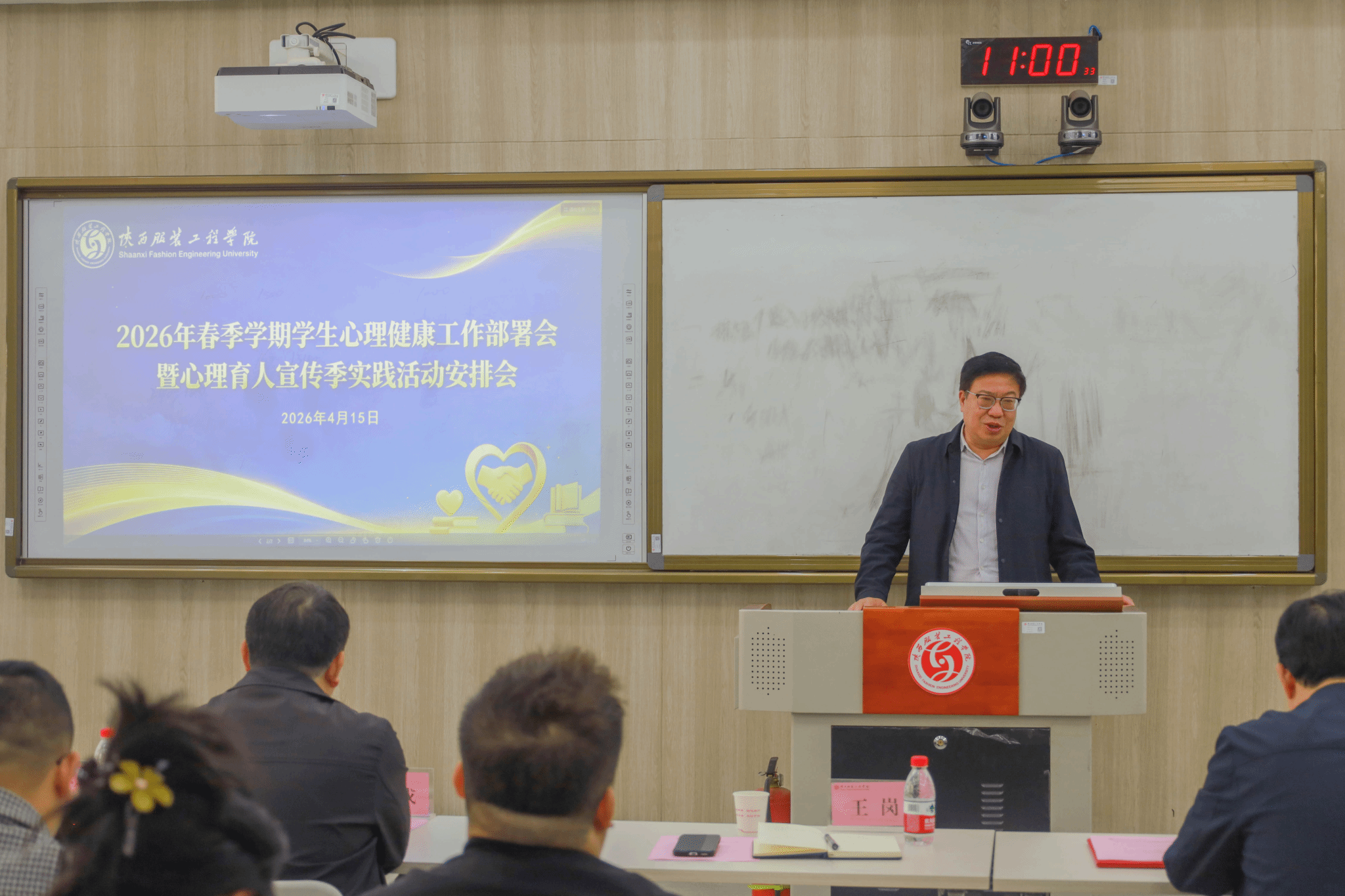 为深入贯彻落实陕西省教育工委关于学生心理健康工作的部署要求,全面推进健康学校建设,4月15日,我校2026年春季学期学生心理健康工作部署会暨心理育人宣传季实践活动安排会在B209智慧教室召开。校党委书记王岗,党委副书记、纪委书记刘继兵,党委组织部部长伍建成出席会议,各二级学院主管学生工作院领导、学工办主任、学生工作部全体干部及全体辅导员参加了会议。会议由学工部负责同志主持。