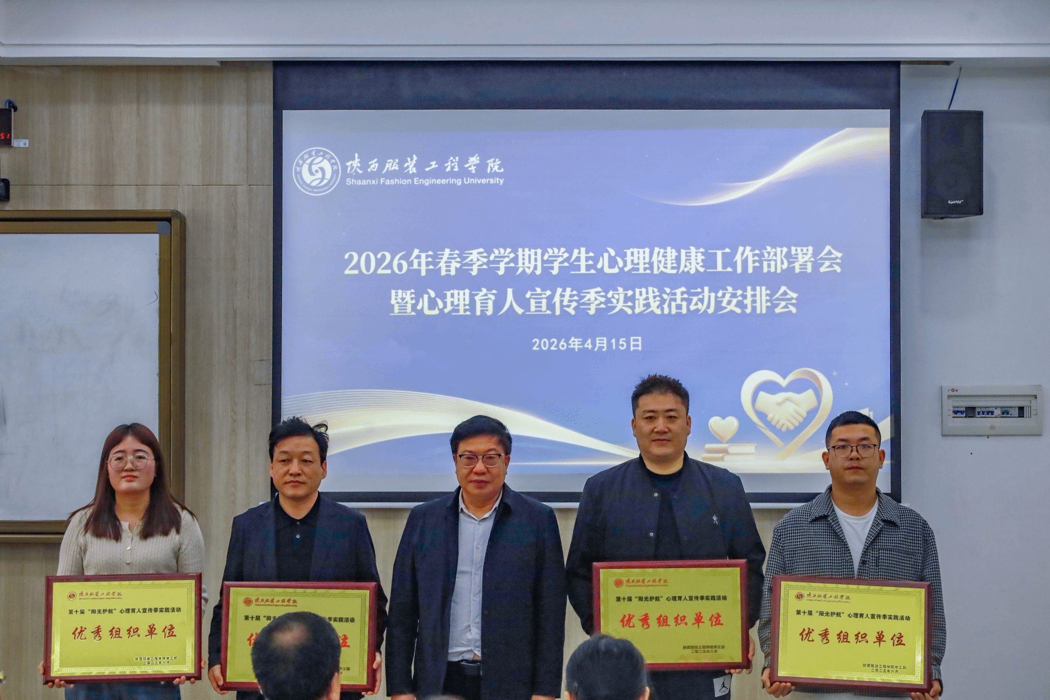 会议上,全体参会人员共同观看了2025年心理健康教育工作总结视频,回顾了过去一年我校在心理育人方面取得的阶段性成果。校党委副书记刘继兵通报了我校在省级心理健康教育相关评选中获得的荣誉,并宣读了陕西服装工程学院《关于我校第十届“阳光护航”心理育人宣传季实践活动成果表彰的决定》。在热烈的掌声中,王岗书记为获得第十届“阳光护航”心理育人宣传季实践活动优秀组织单位的服装学院、教育学院、健康学院、应用技术学院颁发了奖牌。